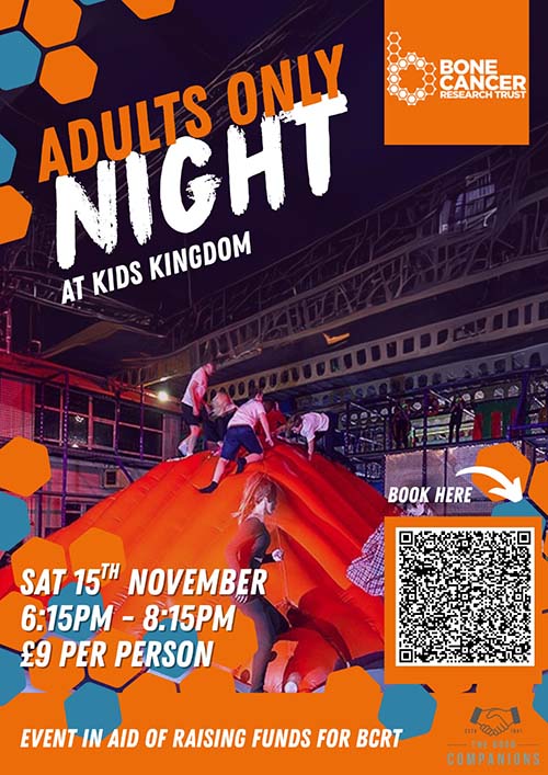 Come join us for a fun adults-only night at Kids Kingdom to support Bone Cancer Research Trust! Ever fancied the chance to go on the jelly mountain or the slides at a play centre? Do you ever think that children have all the fun?