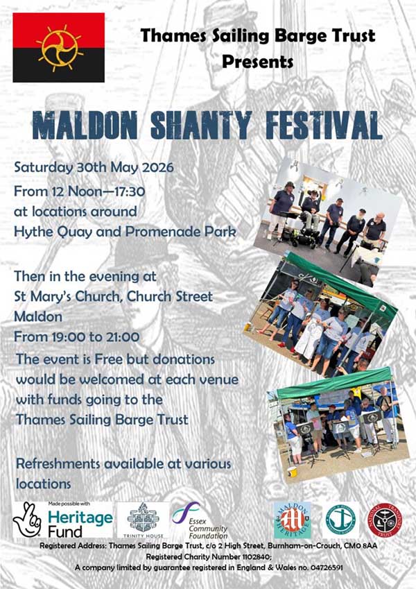 This is Maldon's second Shanty Festival and is organised by the Thames Sailing Barge Trust, to raise funds for the Trust which is a registered charity to help maintain and operate its two historic Thames sailing barges.